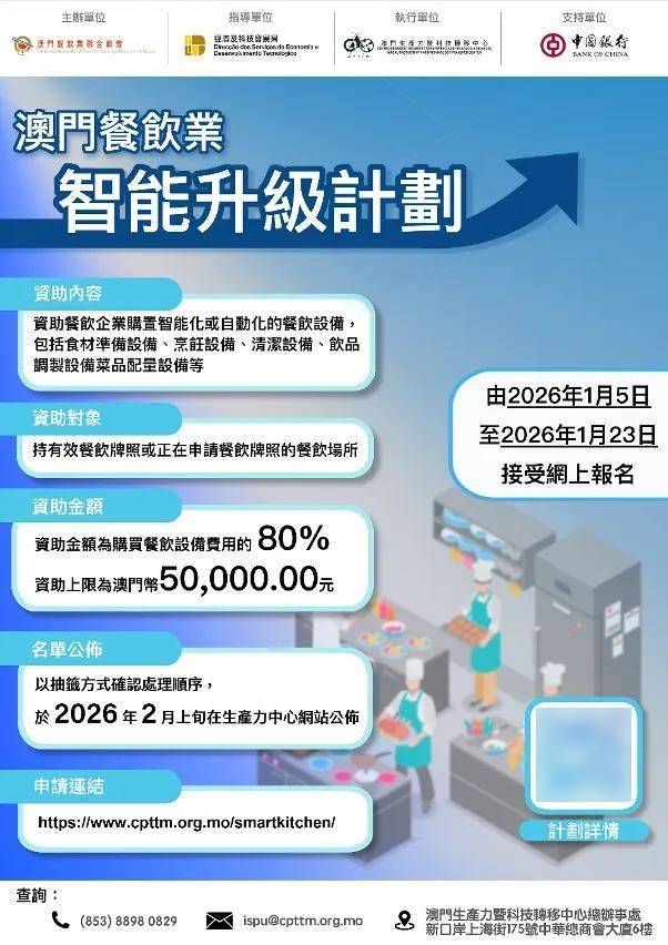 成心申请的企业可先行联络供应商领会设备详情,确认所需设备后,可透过线上系统提交申请。申请截止后,施行单元将对合伙历企业进行抽签以确保处置的挨次。曾申请“澳门餐饮业智能升级先导打算”,合适伙历但未获赞帮的餐饮企业,其申请将从动纳入本次抽签,中签名单将于2026年2月正在出产力核心网坐发布。